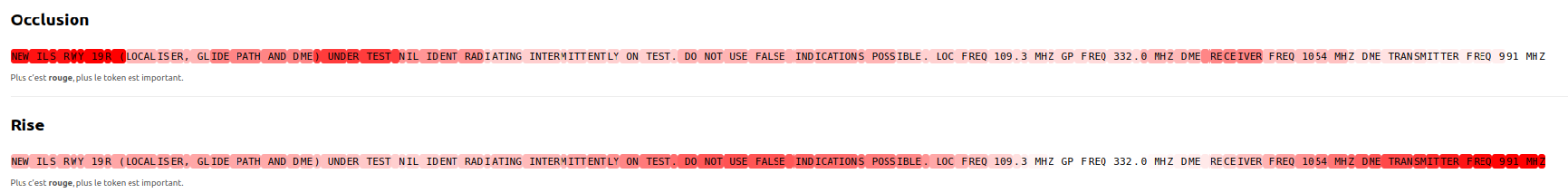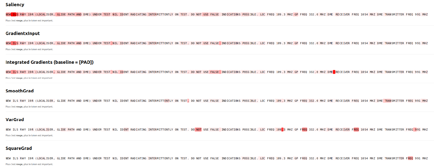 En NLP, IG est appliqué dans l’espace des embeddings : si $e(x) \in \mathbb{R}^d$ est l’entrée réelle du réseau (embeddings de tokens concaténés), on interpole $e’ + \alpha(e - e’)$ et on différencie $f$ par rapport aux composantes de l’embedding. La baseline $e’$ est souvent le vecteur zéro, un token [PAD], ou un embedding neutre.